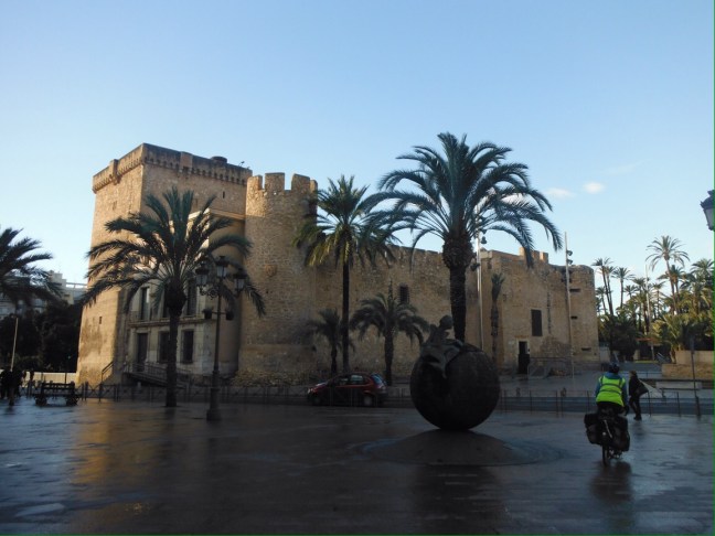 Alicante is chuffing huge. The bike lanes are extensive but rubbish as they go up kerbs and have stop signs for driveways every 150m. We stick to the road, where there are roundabouts that are not really roundabouts. We are so nearly clear of the city and on a bike lane to Elx/Elche when we hit silt filled underpass that coats us and the bikes in mud. The wheels stick in the mudguards and our shoes sink as we drag the bikes through. We use our water bottles to squirt the worst off the moving parts. The bike lane is smooth after this though.