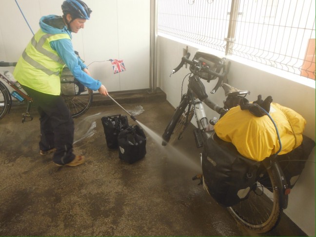 There are so many petrol stations in Spain, but none are on this road. We really need a jet wash. Eventually we find one and clean the bikes and ourselves. The cafe next door fill up our water bottles. We eat bananas.