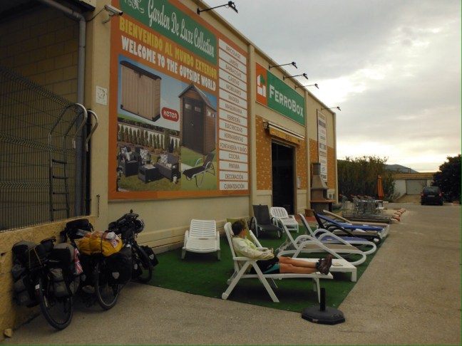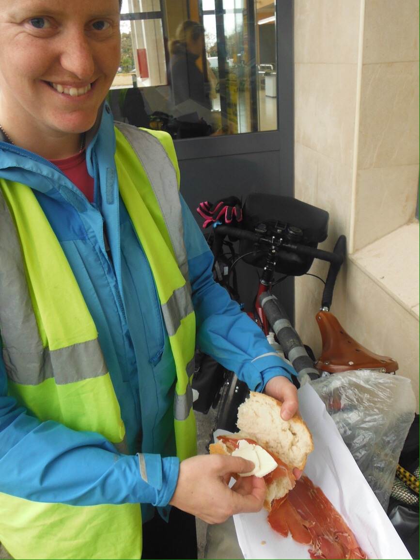 We are hungry. We find a supermarket on the outskirts of Alicante. I brave the ham cutting counter to get great ham. We have our second ham and cheese bocadillo of the day undercover in the supermarket car park. There is even a real toilet. The rain stops.