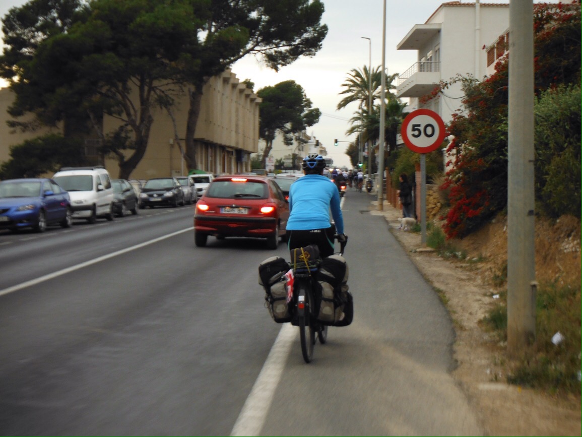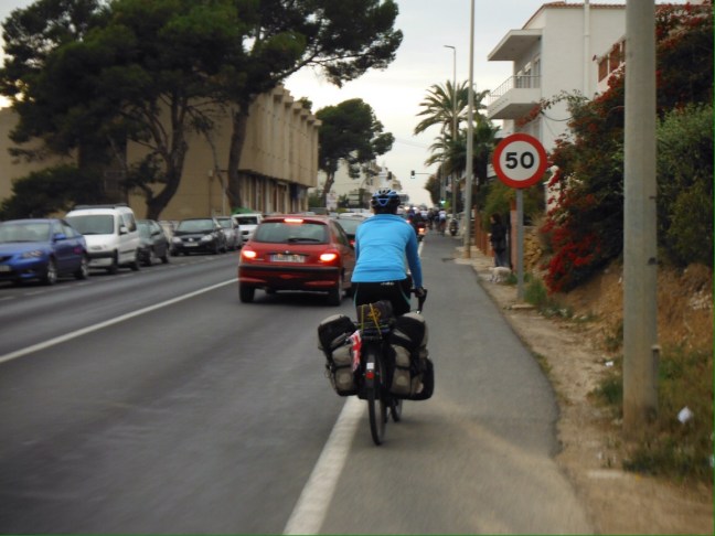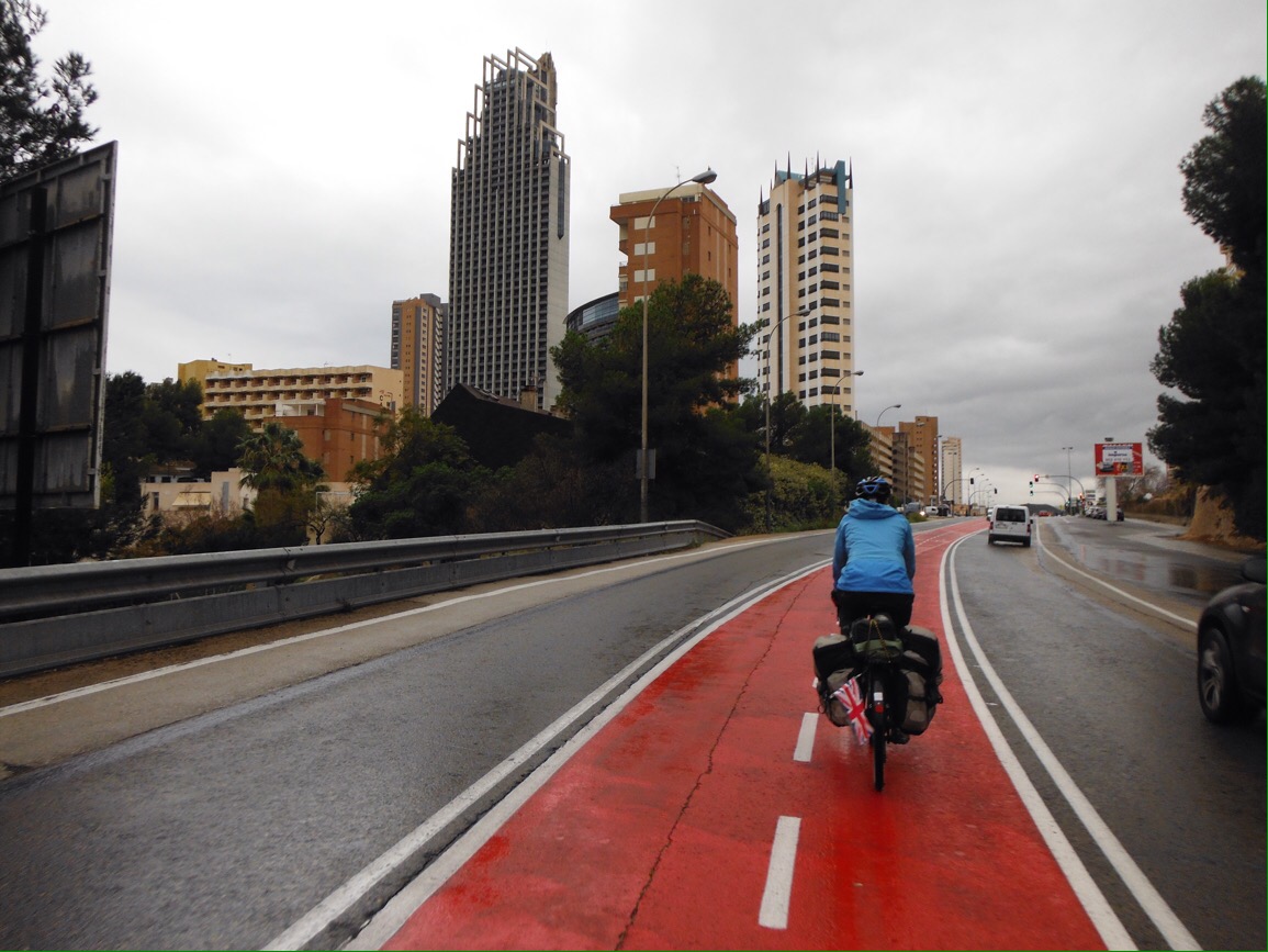 It is raining. Follow bike path along sea front. It ends. Join much larger road towards Alicante. The rain gets worse briefly. The shoulder is wide and the road smooth, but there is a headwind. Have I mentioned this already? We have had it since Barcelona. Yep, that’s over 500km now.