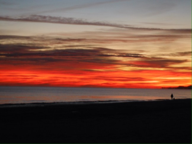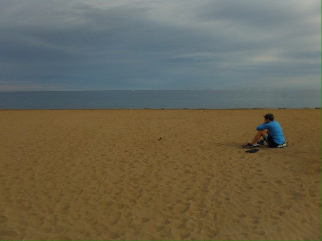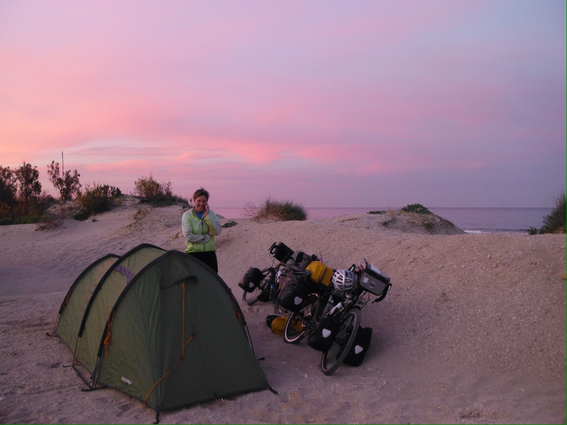Wake up in tent to sound of waves. Jo has slept well, I had cold thighs. (Very specific coldness, strange). Eat slightly stale baguette with jam on beach with lovely red sunrise. It is beautiful. Jo takes many photos. Pack up tent, eat biscuits. Faff around filling water bottles, talking to Dutch people, etc.