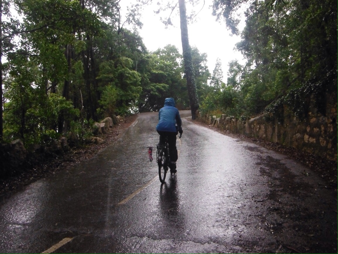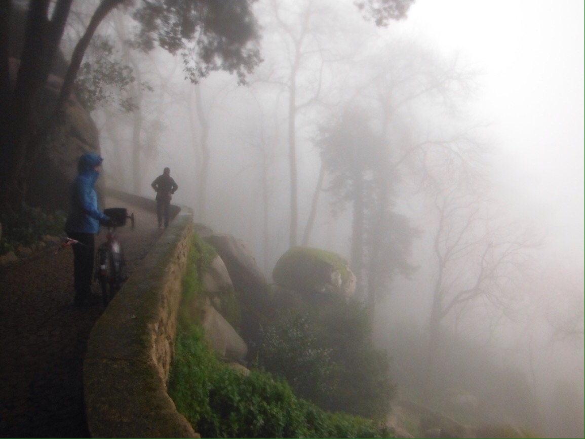 Wondering why we didn’t stay inside eating pastel de nata…Beautiful Sintra (behind the cloud somewhere) We weren’t the only fools there – a few coach loads of people were wandering round with their umbrellas up craning their necks trying to imagine what was the other side of the crowd. Customer service in Portugal hit a new low when we weren’t allowed into either of the palace or castle cafes as they were inside the gates. So we drank nearly-warm tea from our flasks and took shelter under a stone walkway. Until we were moved on from there too. No sympathy for wet cyclists in Sintra. So we went to a cafe and ate tourist priced (double the usual) pastel de natas.