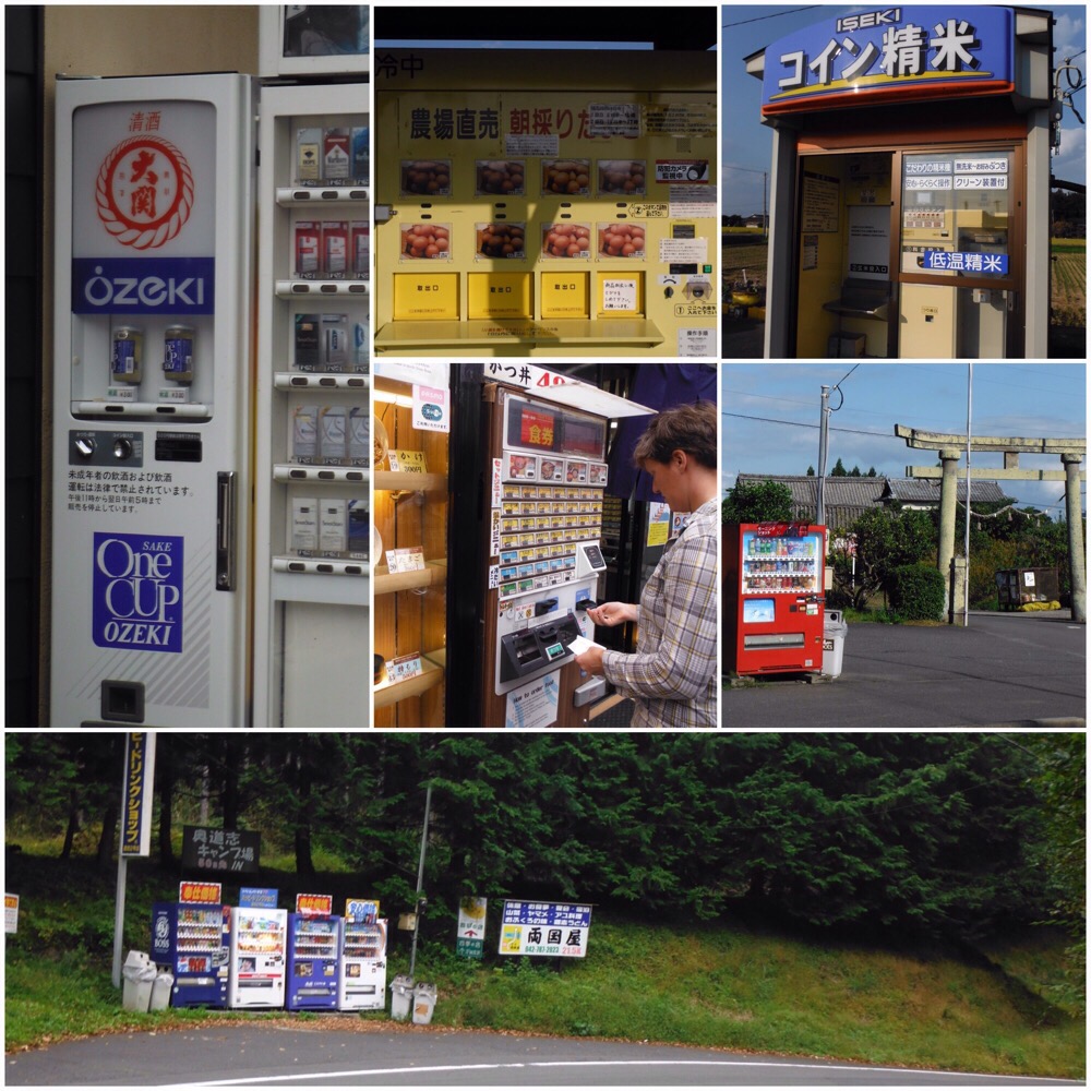 Probably the thing you see most often in Japan, more than convenience stores and shrine gates, is a vending machine. They are everywhere. If you were in a car you would never have to drive for more than five minutes without seeing one, which means on a bike they are pretty regular too. More impressive than their contents were how they were installed, run and refilled in some of the most out of the way places, like the edge of a field. Mostly they have cold drinks, but if you are lucky there will be not one vending machine but a row, with different delights in each. We saw beer, cigarettes, sake (wine), ice cream, noodles. But we were expecting more diversity, and on our penultimate day in Japan vending machines got a whole load more interesting when we saw a lay-by with an egg vending machine and a rice one.