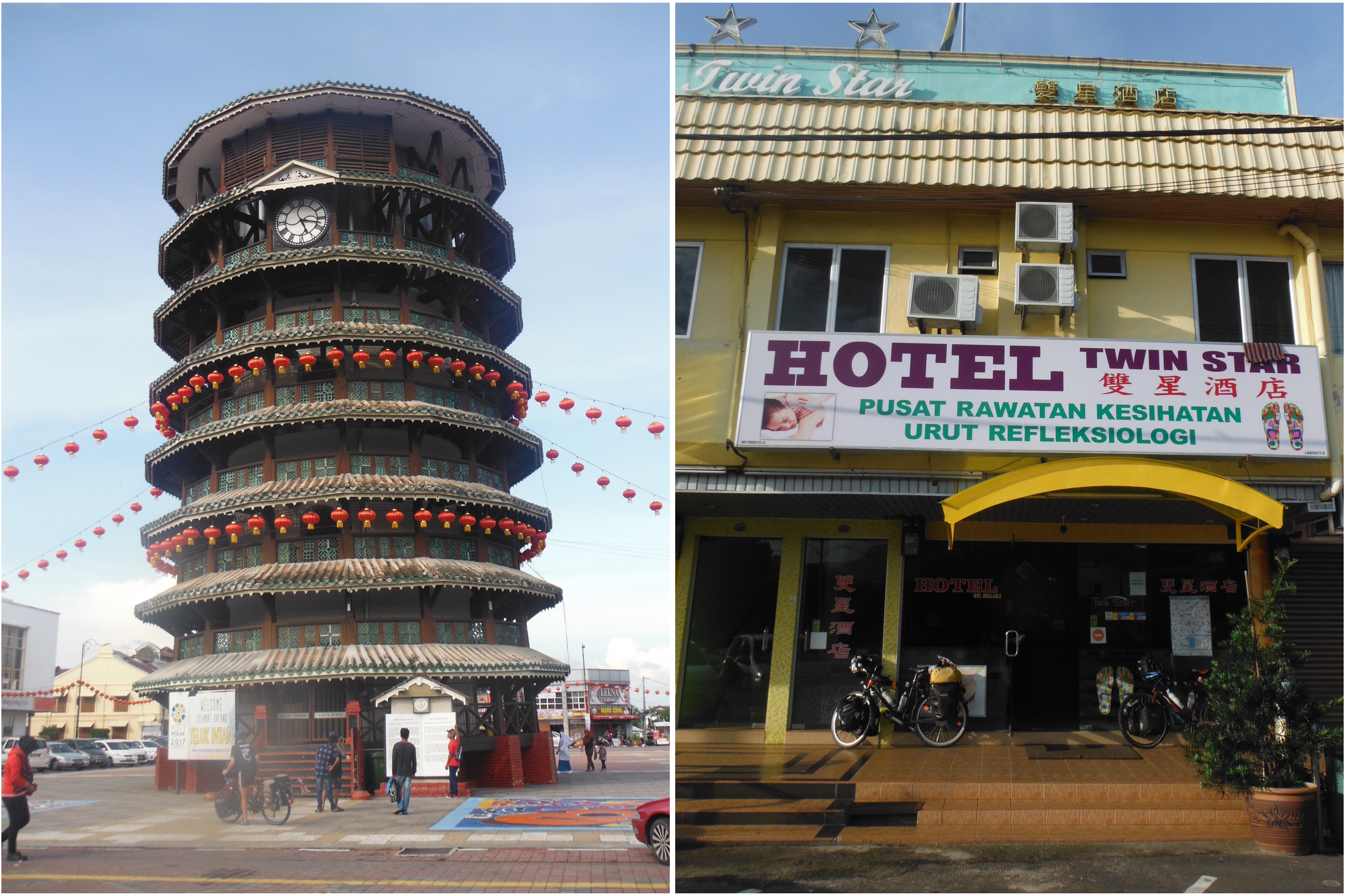 Passports in hand it was time to finally leave the comfort of friends and hit the road proper, with all of our panniers this time. Luckily it’s pretty flat around the peninsula (we had no intention of going into the hilly interior, riding uphill in this heat would be no fun at all) so the riding was not too taxing. We were heading north for Thailand, via a few west coast island stops. The scenery comprised mostly of palm tree plantations, for palm oil. I do love palm trees, I think there’s something quite exotic about them as a Northern European, they are always associated with holidays, and not just any old holiday to France or wherever but to somewhere considerably warmer and far away. But after a few days of riding alongside them, they lost their novelty a bit. Luckily we passed through towns regularly enough which are interesting. These are not tourist towns, but places where people live and go about their daily activities. The towns that visitors would normally bypass on a bus or a train. We spent our first two nights in the towns of Tanjong Malim and Teluk Intan, not mentioned in any guide books. We were pleased to find cheap hotels with air con in both and the leaning tower of Teluk Intan.