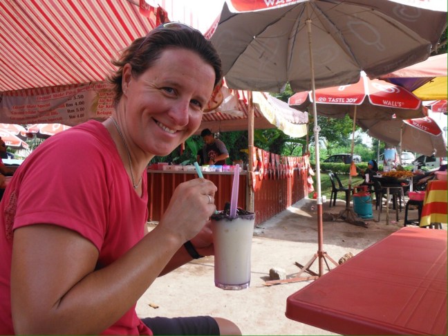 The actual cycling here is pretty good. The scenery hasn’t been spectacular, but the drivers are fairly considerate (there are so many mopeds on the road there seems to be a certain level of tolerance for slow vehicles). Road surfaces are mostly good. On the whole,the road experience is an improvement on New Zealand. But everyone stares at us. Properly stares. This hasn’t really happened since Southern Italy over a year ago. Moped riders in particular slow down and stare, their eyes not leaving us as they ride past. This results in a particularly impressive skill of rotating their heads almost 180 degrees to be able to keep staring when they are in front of us, and somehow maintaining forward control of their vehicle. Most truck drivers that pass hoot their horn and wave at us. Cars with families in the back do the same and there are often several hands hanging out of the back window waving as they pass. Kids by the side of the road stare, we wave, they look even more confused. Who are these people with strange coloured skin, eyes and hair? It’s not surprising really. It would be like someone with green skin, pink eyes and red hair riding an unidentifiable object along Leicestershire roads. Or a driver and his Hello Kitty trishaw cycling in Bradgate Park. People would stare. So it’s ok. It’s strange to think that even in SE Asia, well set up for the tourist, we can ride through towns on our bikes where white people are a rare occurrence. We are getting used to being the only white faces in a restaurant, on a train, in a park. But it’s not a problem – on the whole people are interested, welcoming and want to speak to us (the level of English here is very good which makes life easy). Despite the sweat, it’s all fun so far.
