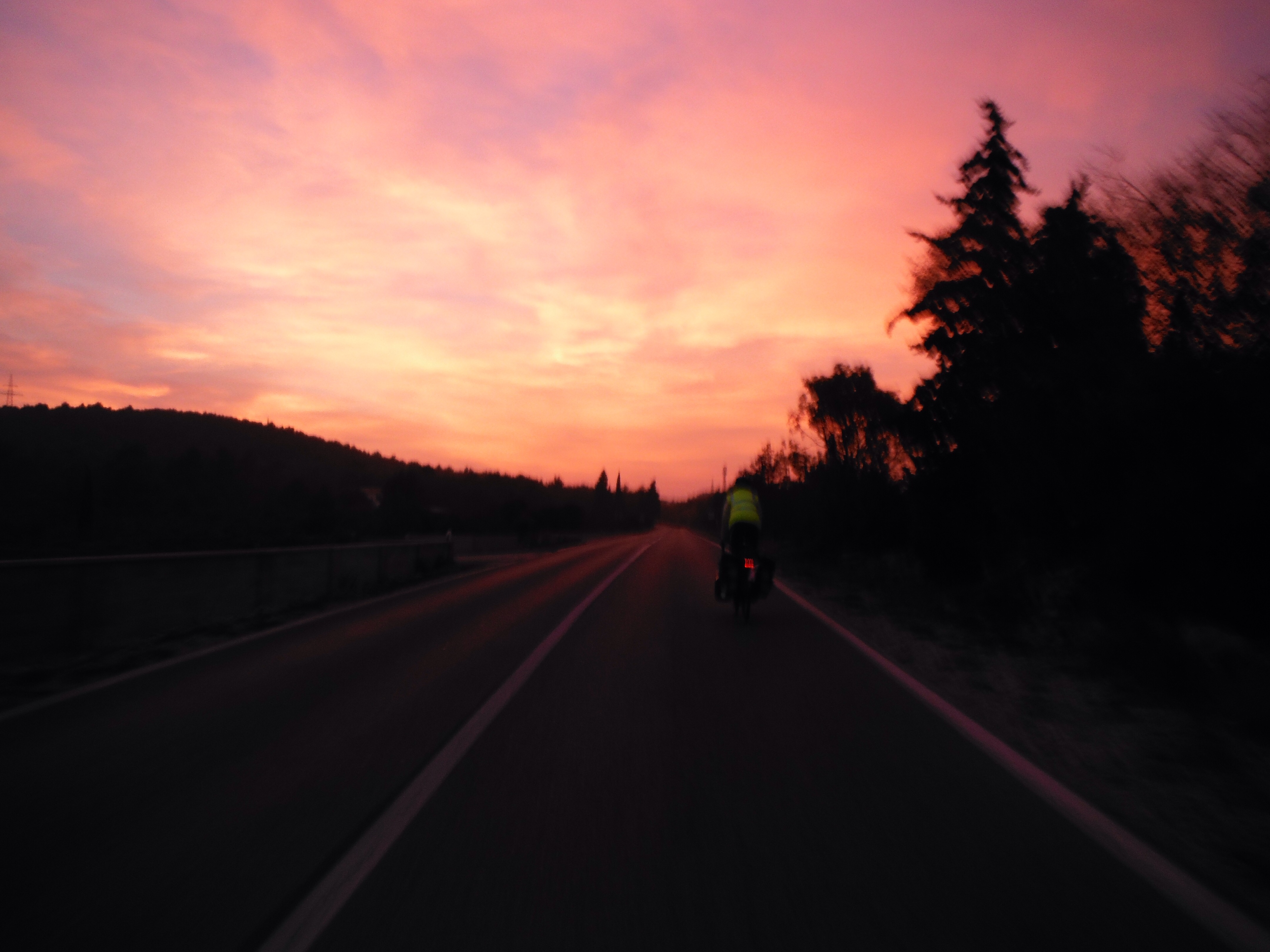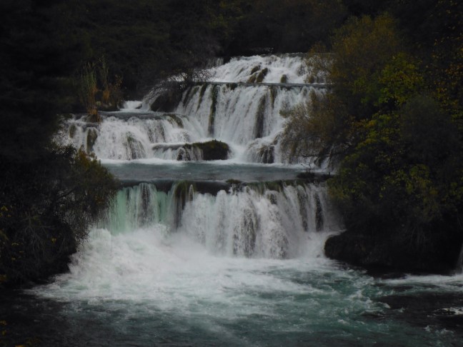 From Zadar it was a 100km ride down the coast to Krka National Park, our substitute for not being able to detour inland over a huge mountain range to go to Plitvice Lakes, the most famous Croatian park. It’s hard to compromise sometimes, but you can’t possibly see everything in a country when travelling by bike – Krka has some very impressive waterfalls itself, we arrived at the park less than an hour before it closed and the falls were at the bottom of a long, hairpin descent. The ranger seemed to think it wouldn’t be a problem for us to ride down and back up again in time – he has clearly never ridden a loaded bike uphill. We zoomed down there in 5 mins, had a walk around the falls and then it took half an hour to get back up sweating like crazy, arriving back at the gate a respectable 25 mins after the park closed. So as usual we had a race against the daylight, which as usual we lost.