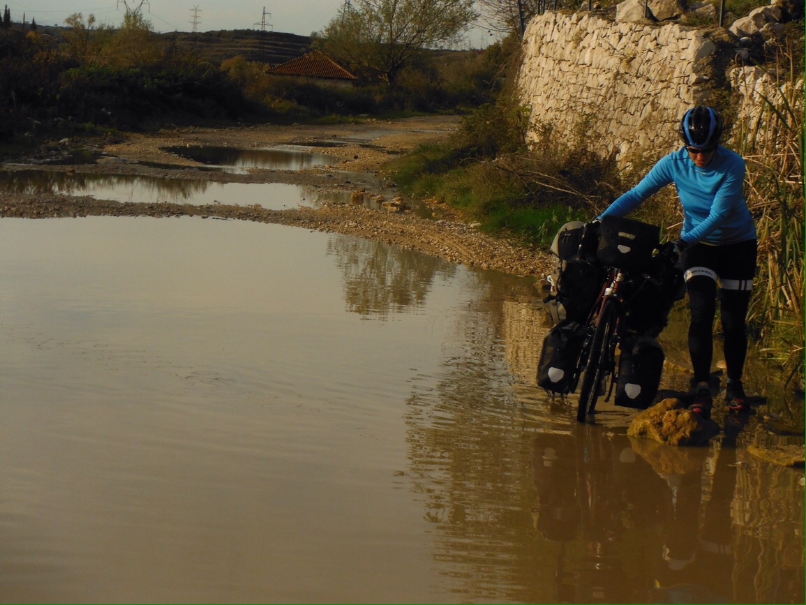 Our rapid progress was unsustainable – we had left the highway where it became a motorway (following a sign for Kosovo, not something you think will ever happen), and although the detour was initially on an ok road this did not last. Once we had passed the last car wash in the town the road really deteriorated. In Albania if there is no petrol station and/or car wash every 500m a road just isn’t worth travelling on. This road was on our map, and looked to be a reasonable one, it had a number. It also had a lake. There had been many potholes and puddles, but this the whole road and some of the land either side. Handily, and enterprising local had put stepping stones along one side. We stepped but the bikes had to wheel through, and.were very grubby by the end. First 80km – 4 hours, next 8km – nearly 2.