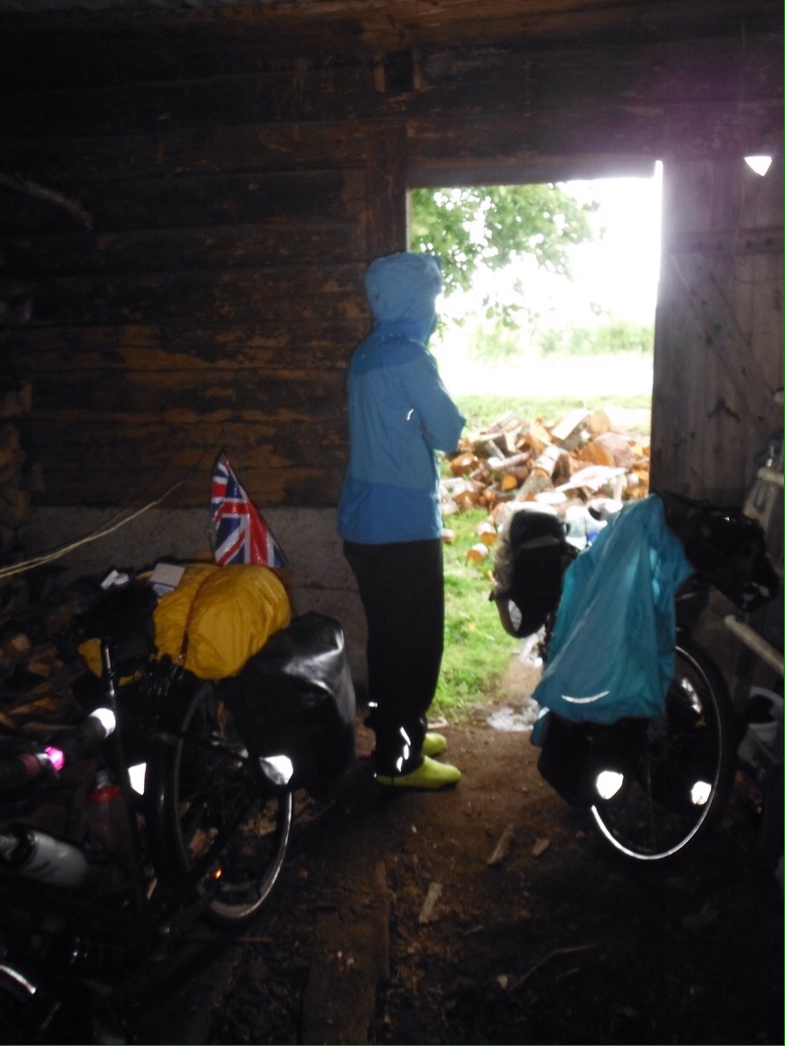 Keen to continue its new reputation for stimulating encounters, on day two Estonia gave us all of the weather. All of it. Except snow. The wind blew strongly all day with unpredictable gusts. After 2 hours and 13km we sat in a bus stop for partial shelter and questioned our life choices. Later, we spent an hour huddled in an old woodshed that we found open, while torrential rain and hail smashed the road. The saving grace was the pack of hot sausages I had bought at the supermarket, which just about made up for the nasty smell in the shed.