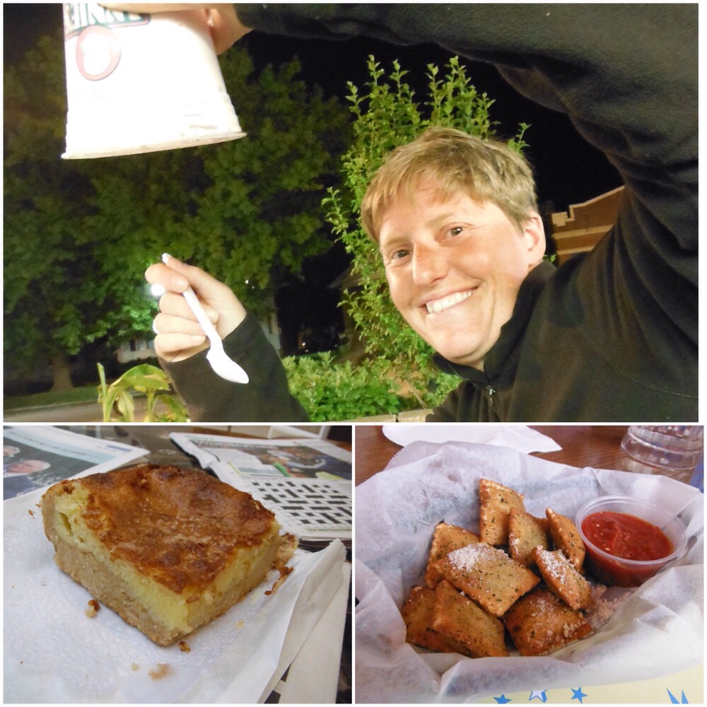 Before leaving St Louis we just about had time to try some local delicacies. On the way we had already experienced concrete, a frozen yoghurt that does not move when you turn it upside down. Second up was gooey butter cake, a cake that was very gooey and buttery. Finally we went out to Blueberry Hill, a very cool place where Chuck Berry still plays once a month, for burgers. Yes these are everywhere but as a side order we tried deep fried ravioli – though it’s called toasted ravioli for some reason. I prefer it’s abbreviation of T-Rav. Sounds much cooler. And it tastes ok too.