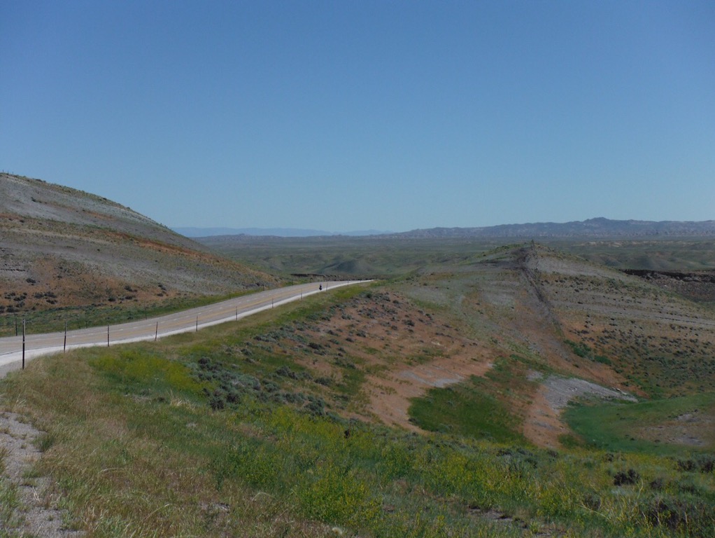6.00am. The sky is clear, the sun is just up and it’s light enough to ride so we set off, our earliest start since we were trying to avoid the Wyoming wind. There’s not much traffic and it’s nice riding. We can even see the snowy mountains behind us.