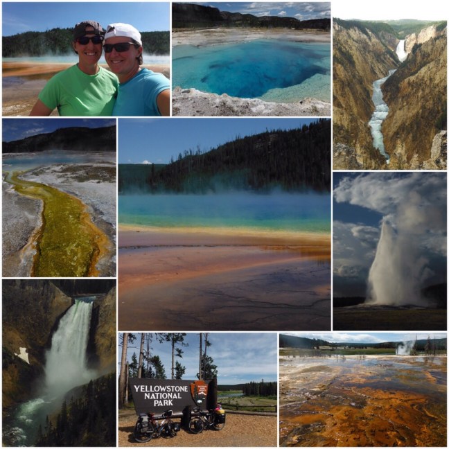 We were also lucky that some friends we had met back in Colorado were also in the Tetons, and offered to drive us around for a couple of days to see some different sights. Grand Tetons and Yellowstone are very much set up for the car driver – there’s no public transport or shuttle buses so if you don’t have a car you have no way of getting around. Justin and Shauna and the Tacoma drove us to a hike to a glacial lake with a 3000ft elevation gain, and the following day we got to explore Yellowstone by car, visiting places we wouldn’t have been able to see by bike. Yellowstone National Park is famous for geothermal activity and geysers but there is also an impressive canyon and huge waterfalls, and loads of bison that just hang out by the road.