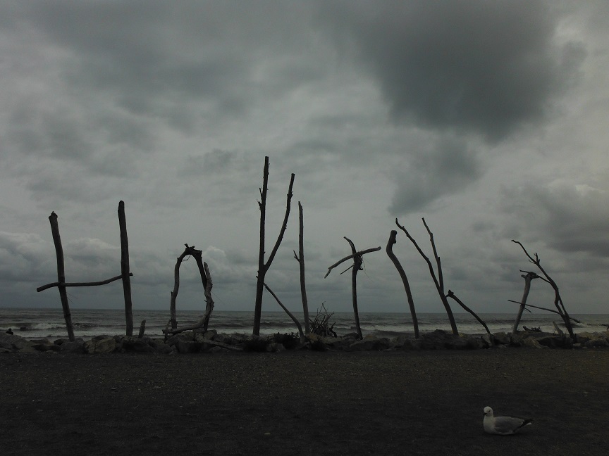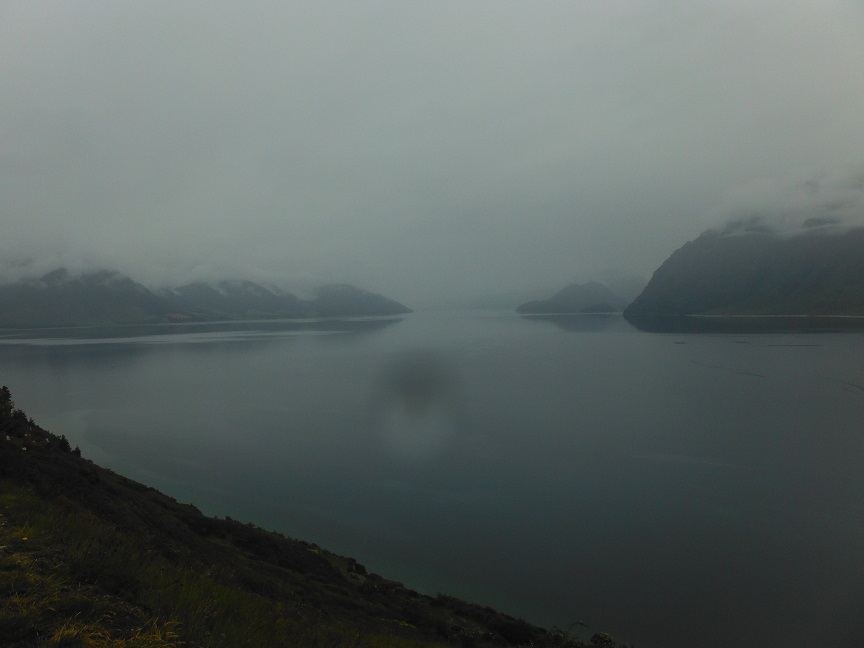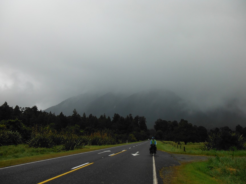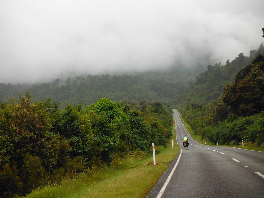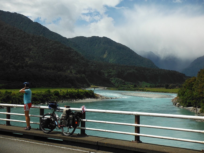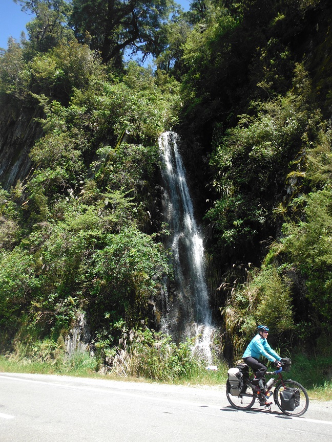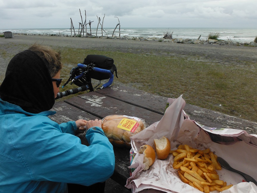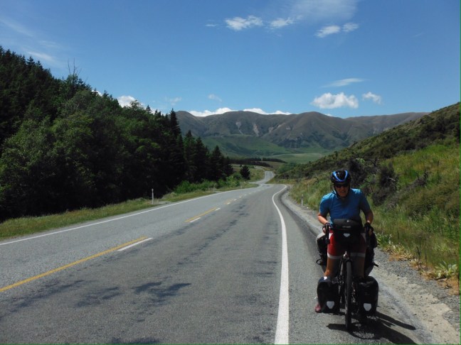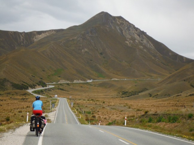 2.00pm. We are getting closer to the top of today’s pass, and it’s all downhill after that. The road gets steeper. A car beeps and pulls over. It’s Greg, who we first met on the road in California and who is now cycling/driving around NZ. As we hardly ever see people we know, this is awesome. He gives us some bananas and we chat for a while, trying desperately hard to stay standing up in the wind.
