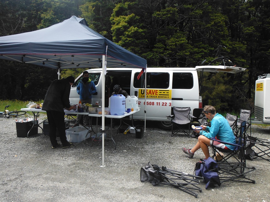 12.30pm. It’s definitely lunchtime now. As we ate our sandwiches for breakfast #2 we need to get the stove out and crack open our emergency instant noodles. We spot a perfect picnic area with 360 degree views, hardly any people and a bench. A DoC (Dept of Conservation) lady comes over and tells us she is about to mow the grass so it will be a bit noisy, and enthusiastically suggests another similar place a few kms down the road with big boulders. We heed her warning and ride on.