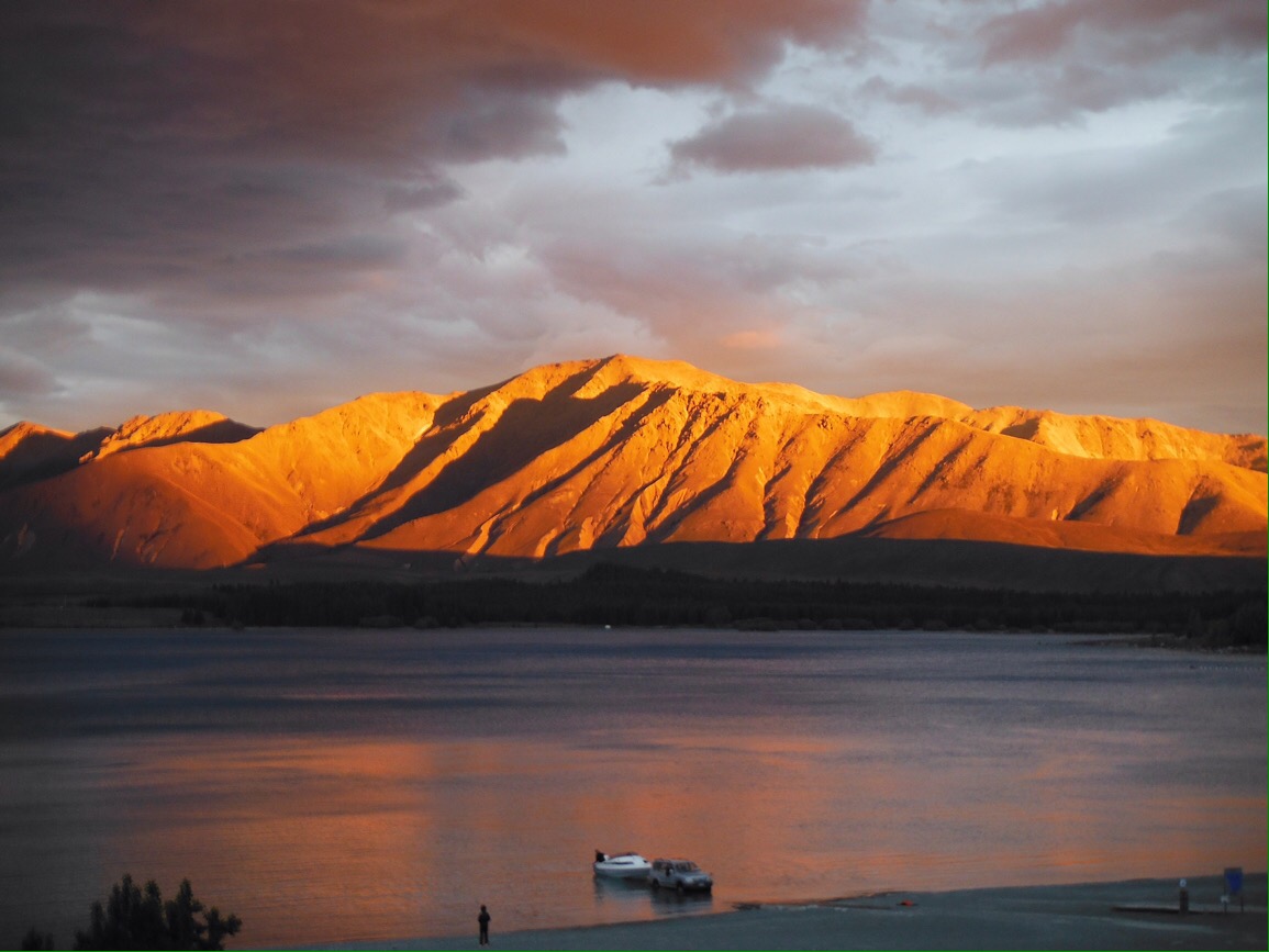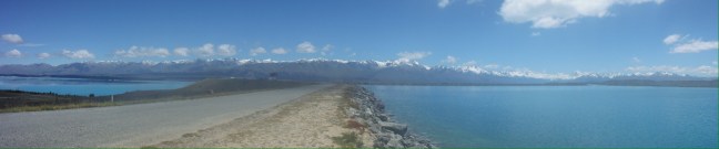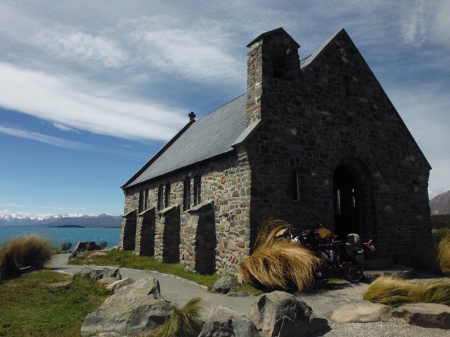 We made it to Fairlie in one piece, but the wind continued to push us backwards almost as fast as we could ride forwards. The 45km to Tekapo took all of the next day, and at one point we had to get off and walk our bikes as the gusts were strong enough to blow us off. Finally crossing Burkes Pass and glimpsing the snowy peaks of the southern alps improved our mood a little but this was tough going. Luckily Lake Tekapo is a beautiful spot and after somehow getting the tent up without it blowing away we found the energy for an evening walk.