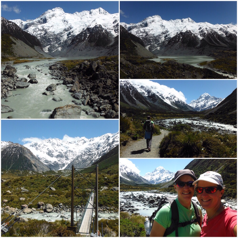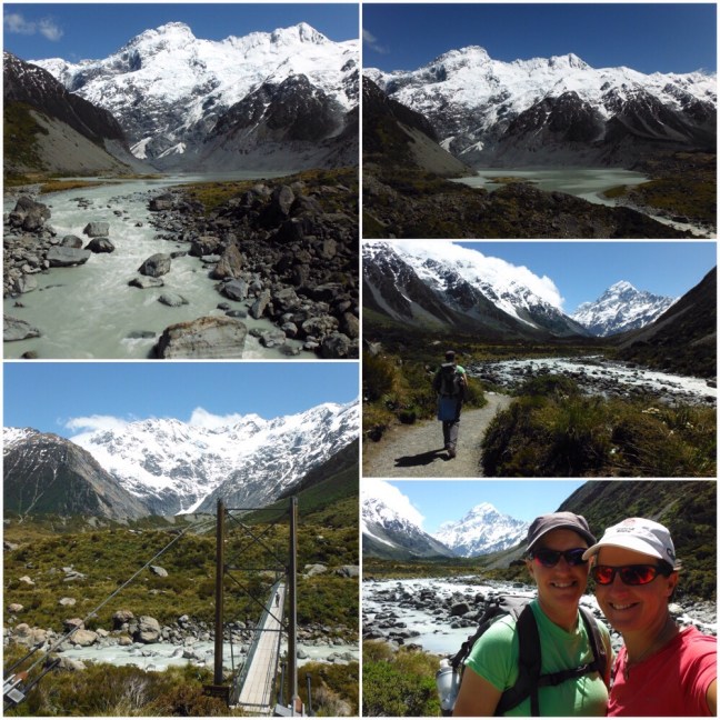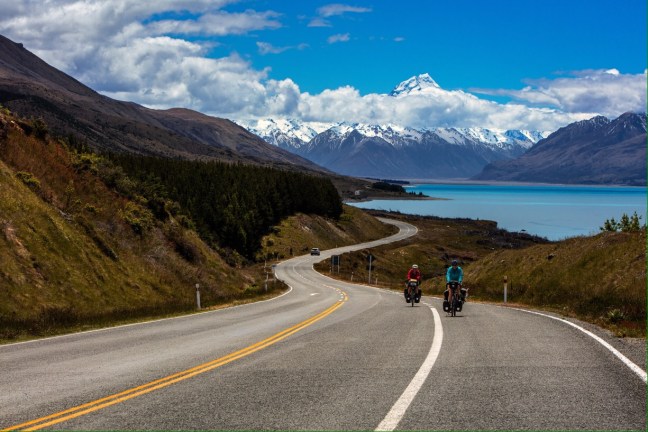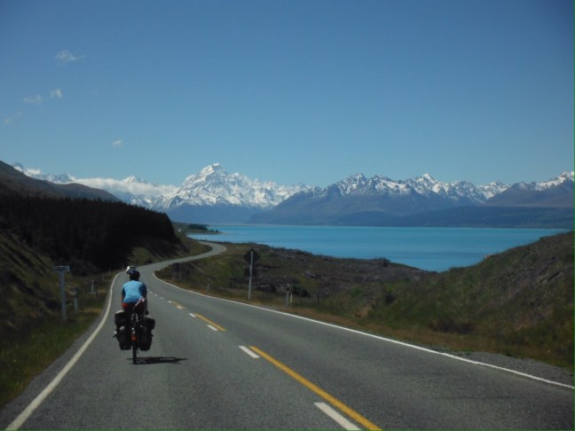 All was forgiven the next day as we had one of the best rides of the whole trip. From Tekapo there is a bike route to the next lake west, Pukaki, on a gated gravel road alongside a canal so perfectly flat. The wind had calmed (and even gave us a bit of a push), the sky was blue and the mountains clearly visible all around us. Water in this area has this incredible azure colour (the photos don’t do it justice) from the glacial flour that runs off the alps. It’s unbelievable, the more you look at it the less real it seems, as if someone has painted over the real colour. It’s lucky there’s no cars to watch out for because I found myself staring open mouthed at the water for the most of the time. We were beaming the whole way. From the base of lake Pukaki it’s a 56km dead end road to Mount Cook village. Having been there before we weren’t convinced about whether to make the detour again but the weather was so perfect we couldn’t resist the ride. An azure lake on one side, forest on the other and the highest mountains in the country up ahead – all under clear blue skies – it really was the perfect day.
