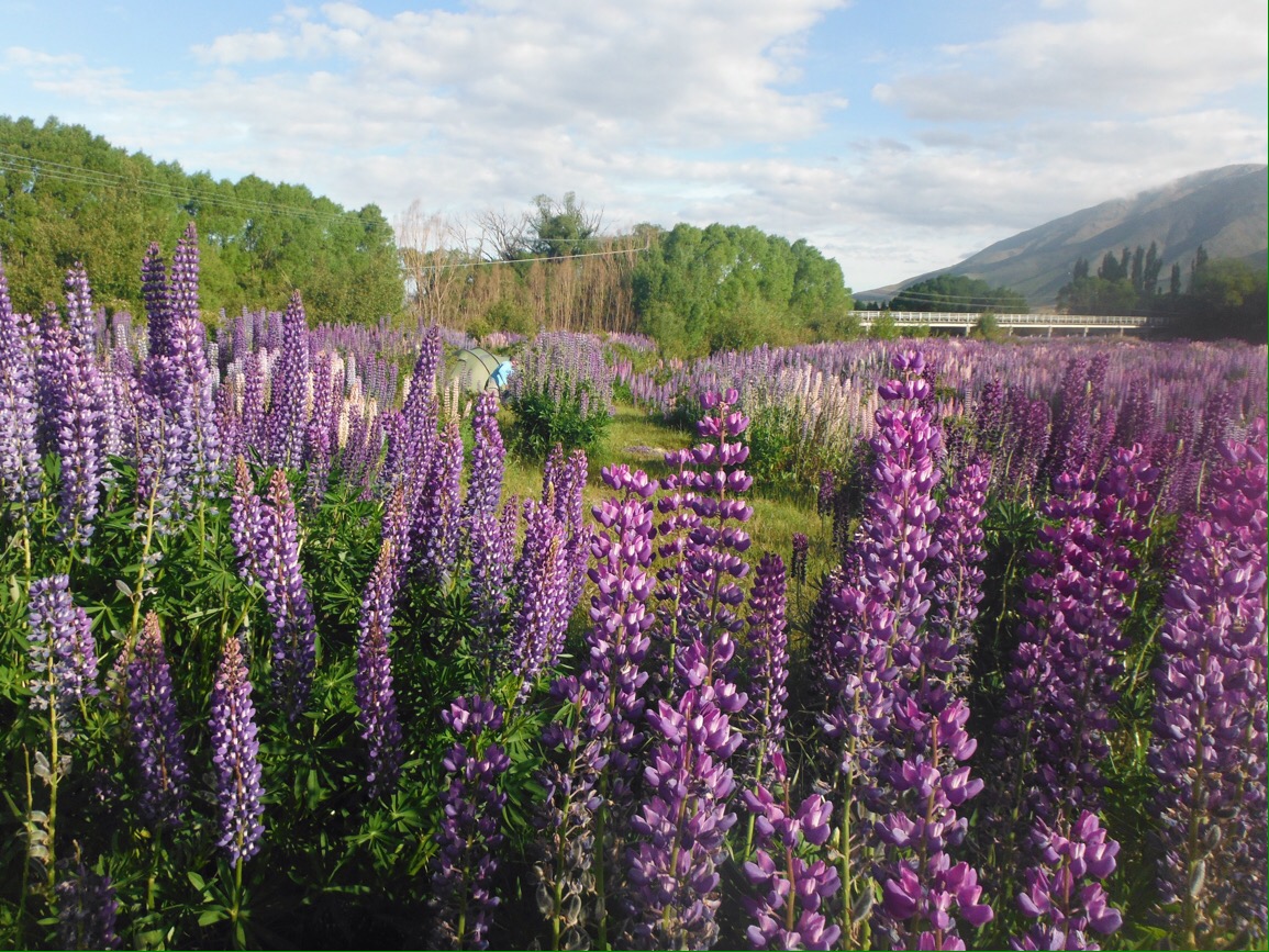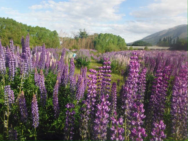 Riding back the way we came alongside Lake Pukaki was just as good, and we had a beautiful three days ride to Queenstown, including Lindis Pass, another of our favourite roads, but with barren hills in contrast to the snowy peaks. In between we found a couple of decent free camping spots – first by a river in amongst the lupines (would have been perfect for a game of hide and seek) and then by a lake.